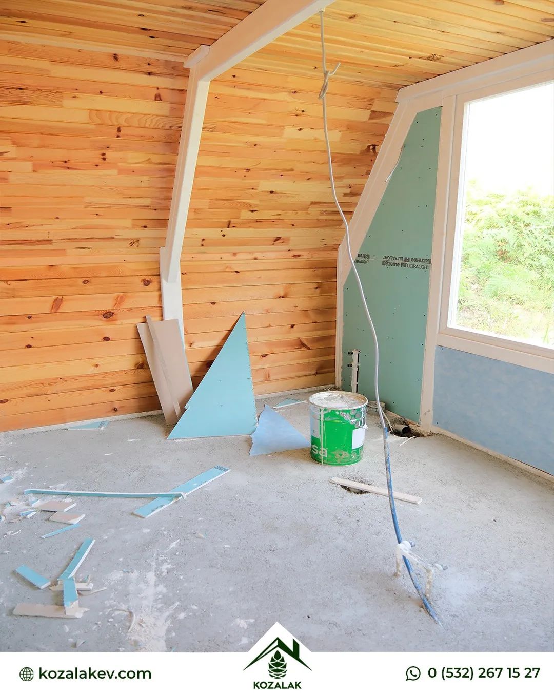 71 m2 Capella71 model evimizin taban alanı 45m2 loft kat 13,5m2 veranda 12,5m2 olmak üzere toplam 71 m2’dir. Yükseklik 7,21m taban ölçüleri 6.25x7.25’dır. verandanın taban alanı ise 2x6.25'dir. Kullanılan kereste cinsi kurutulmuş sarı çamdır.