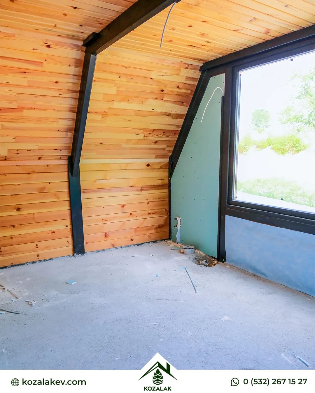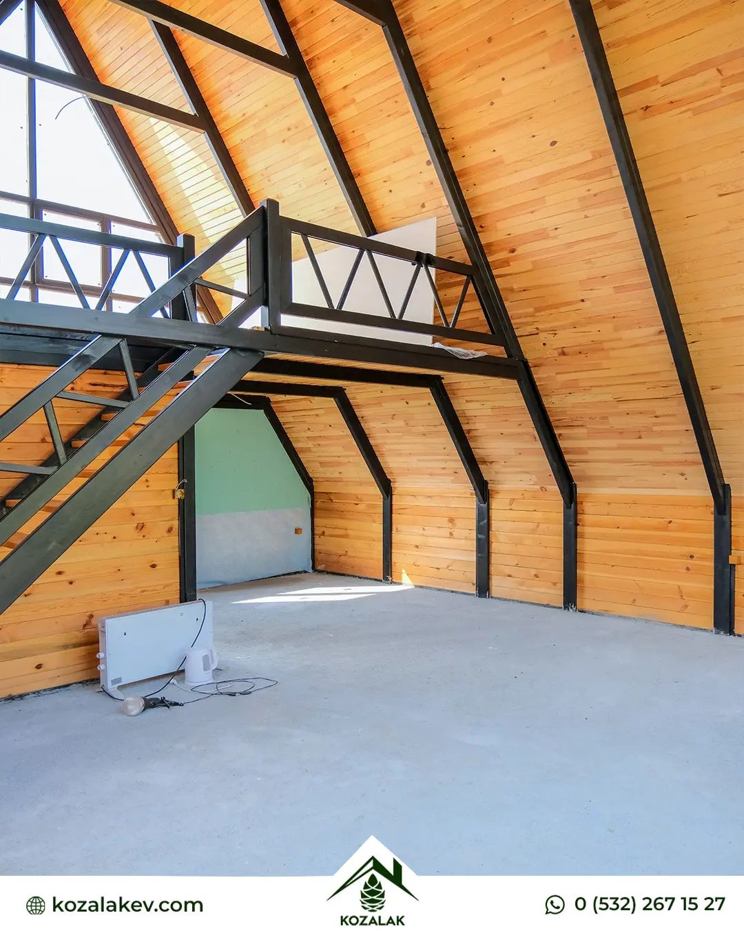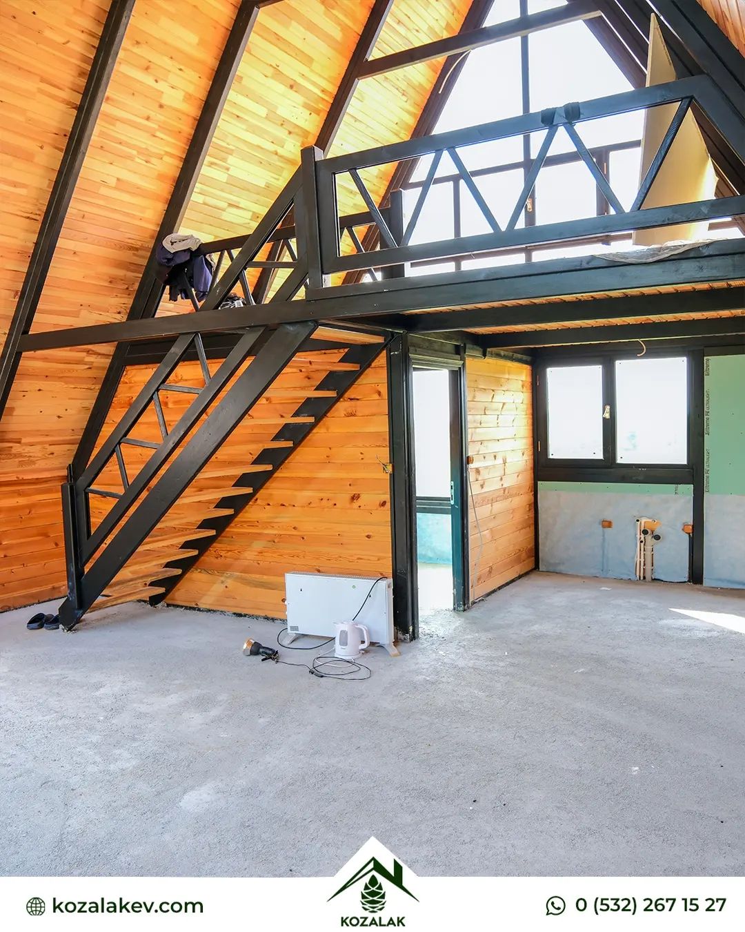 94 m2 Capella94 model evimizin taban alanı 57m2 loft kat 19m2 veranda 18m2 olmak üzere toplam 94m2’dir. Yükseklik 7.21m'dir. Kullanılan kereste cinsi kurutulmuş sarı çamdır.