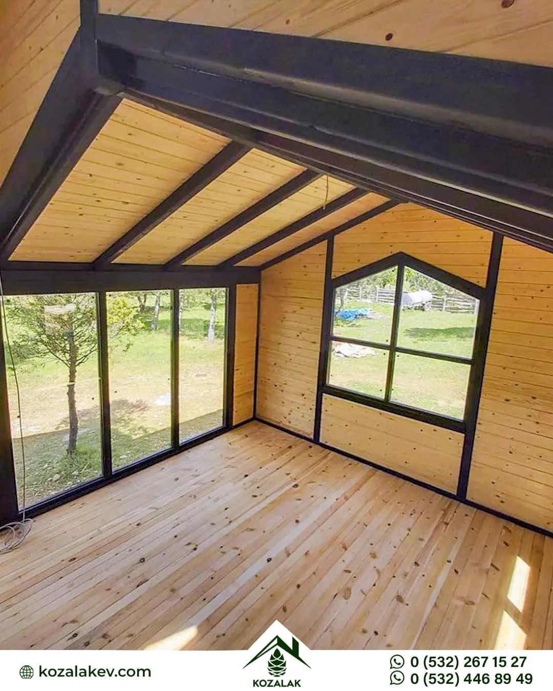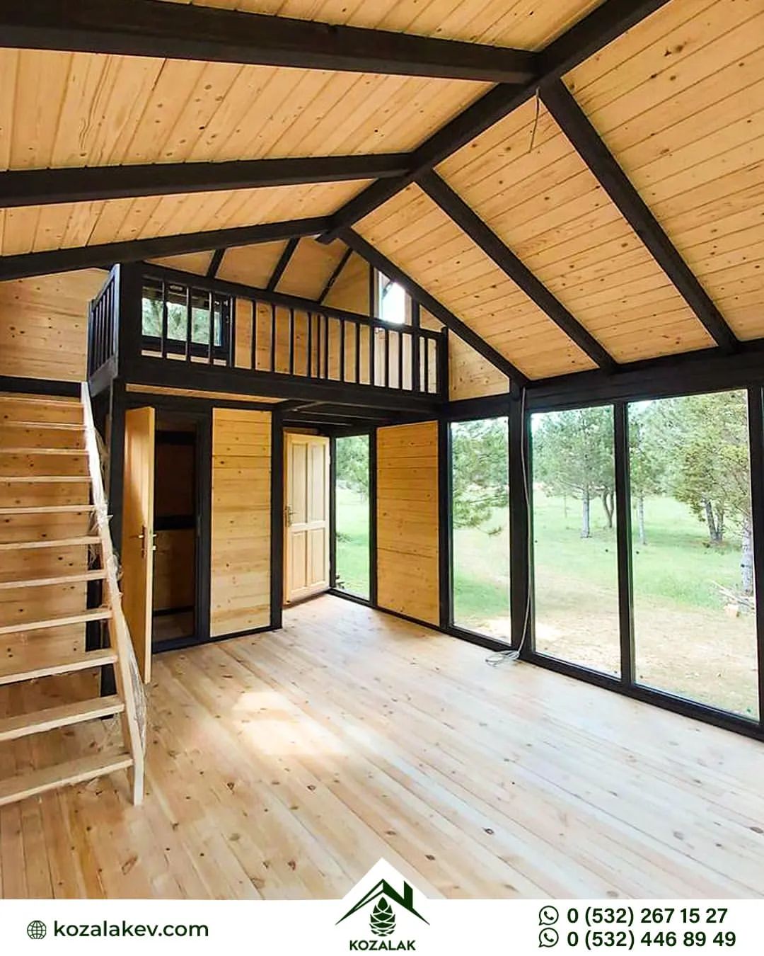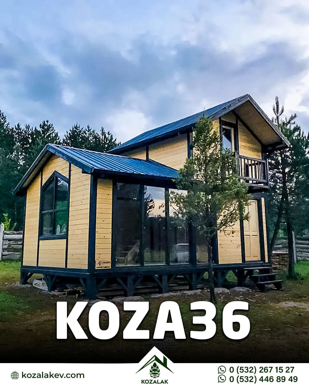 36 m² Koza36 model evimizin taban alanı 26 m²,loft kat10 m² 1+1 salon,yatak odası,banyo ve açık mutfak bulunmaktadır.
