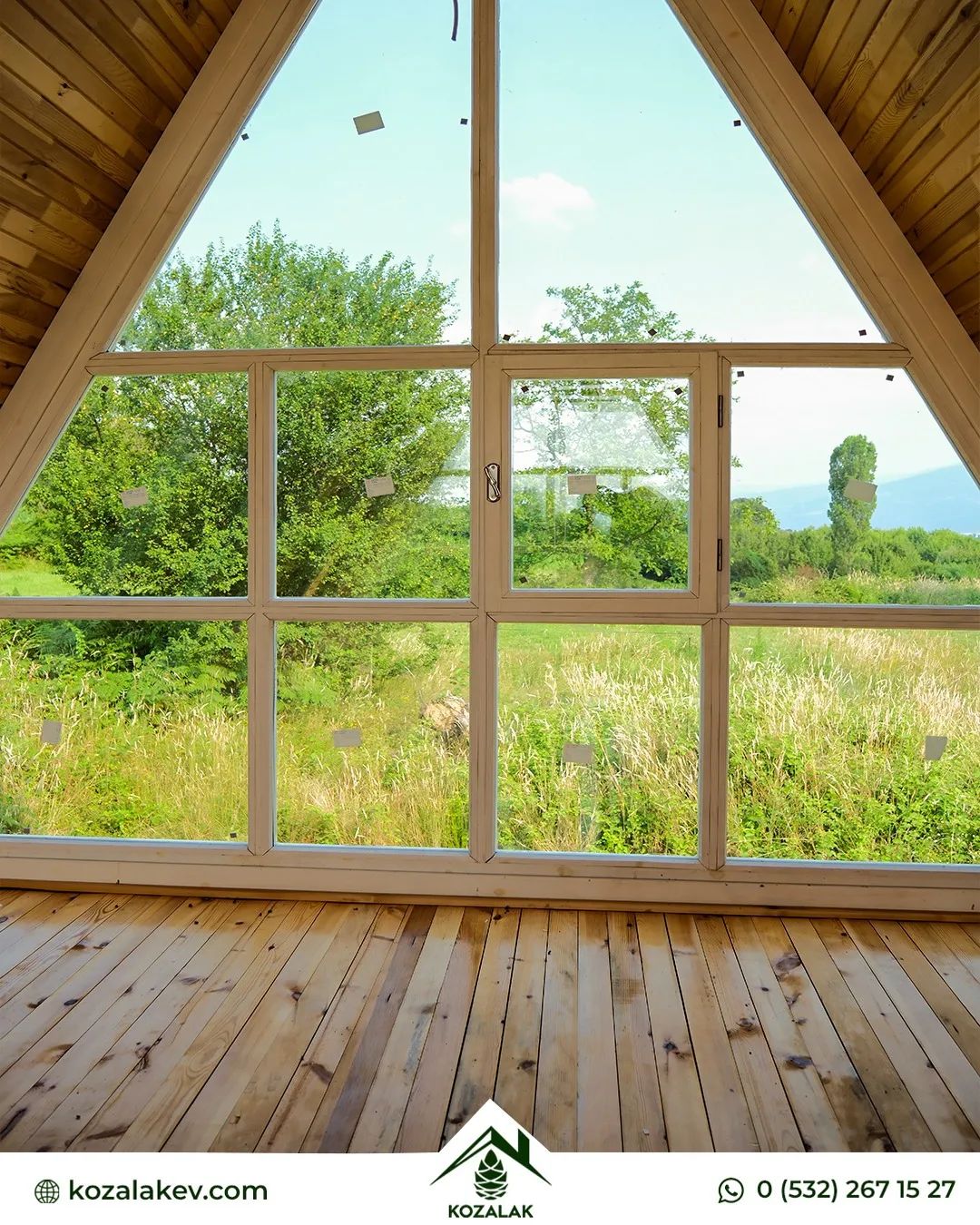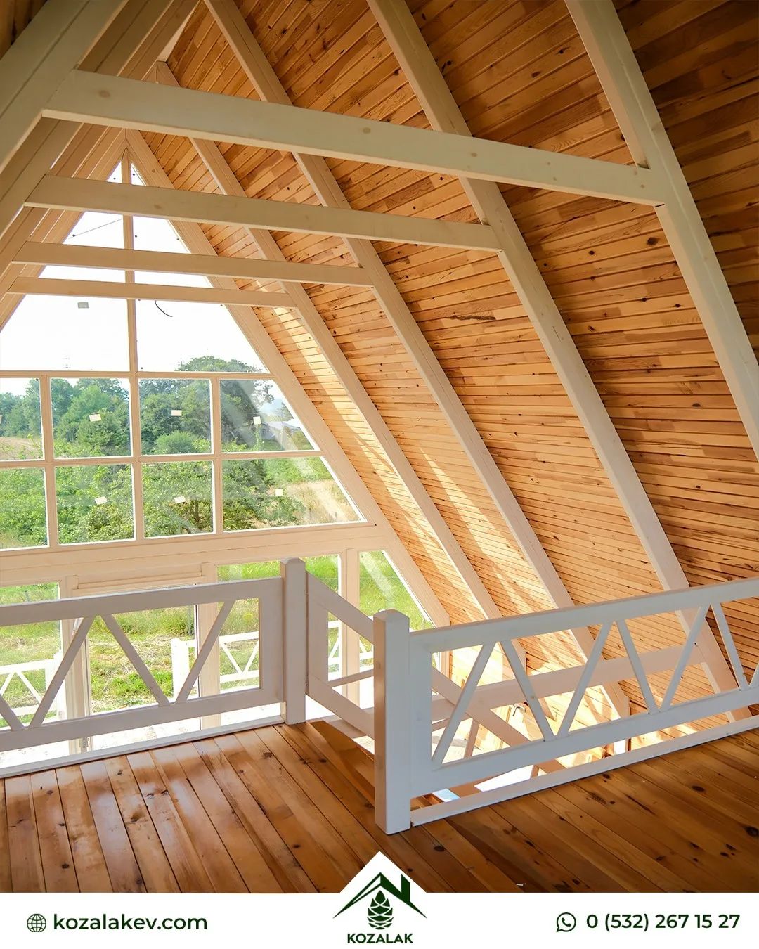 71 m2 Capella71 model evimizin taban alanı 45m2 loft kat 13,5m2 veranda 12,5m2 olmak üzere toplam 71 m2’dir. Yükseklik 7,21m taban ölçüleri 6.25x7.25’dır. verandanın taban alanı ise 2x6.25'dir. Kullanılan kereste cinsi kurutulmuş sarı çamdır.