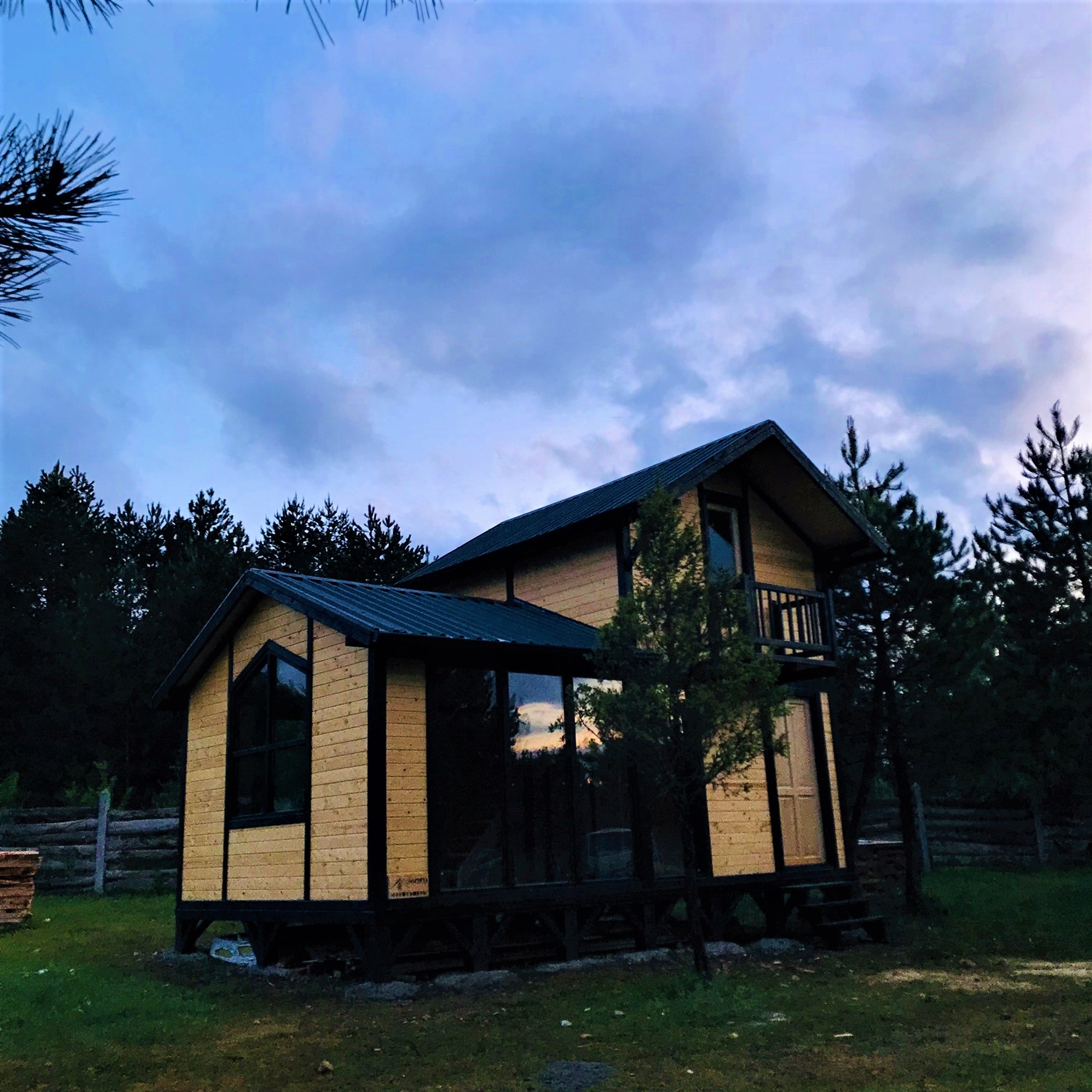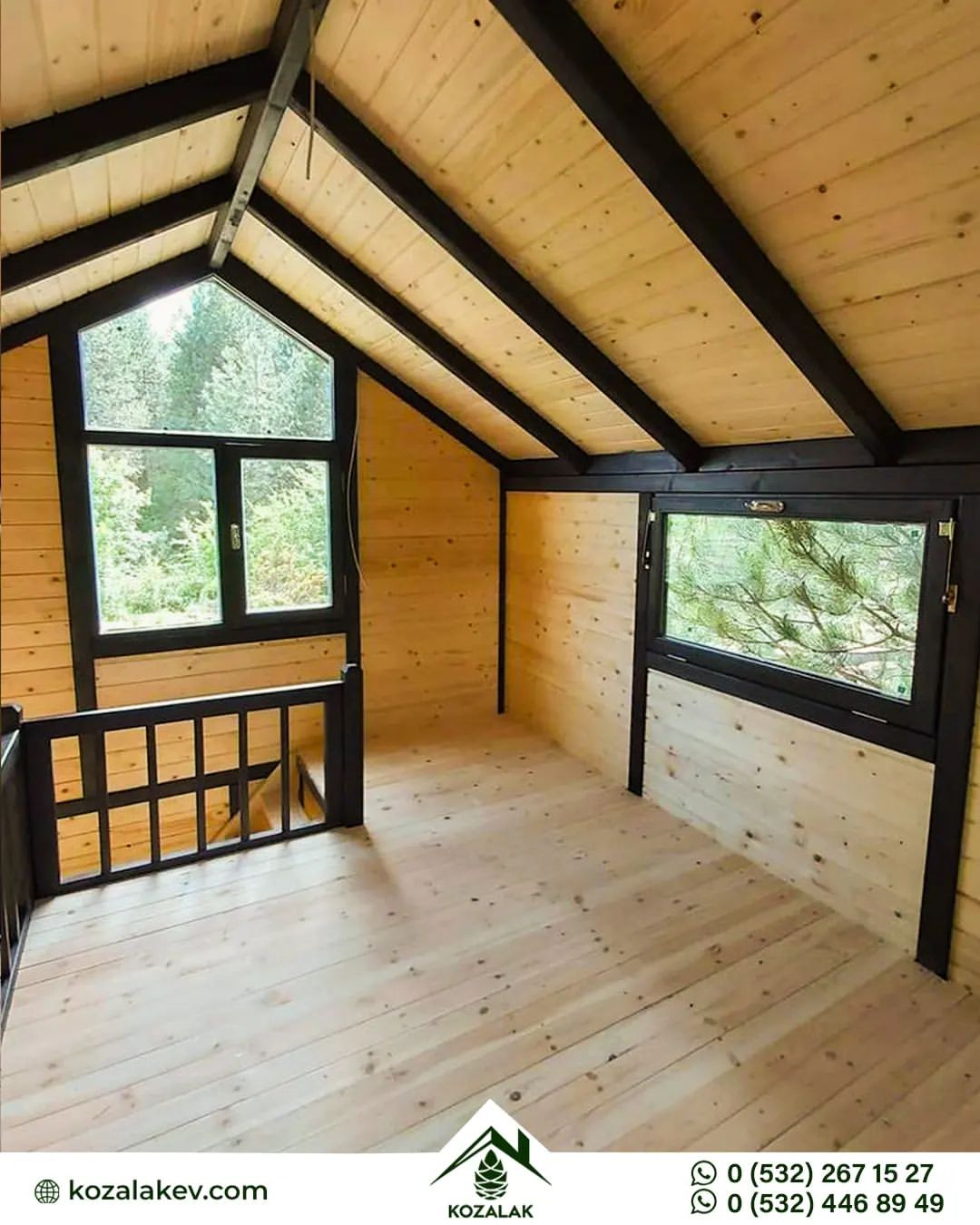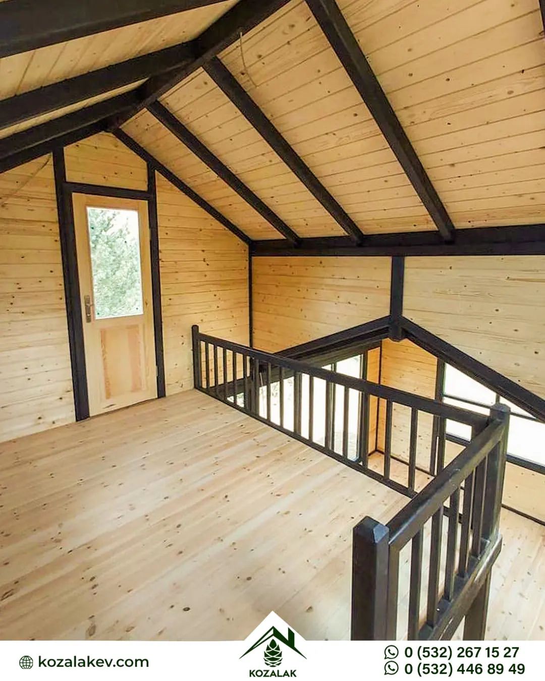 36 m² Koza36 model evimizin taban alanı 26 m²,loft kat10 m² 1+1 salon,yatak odası,banyo ve açık mutfak bulunmaktadır.